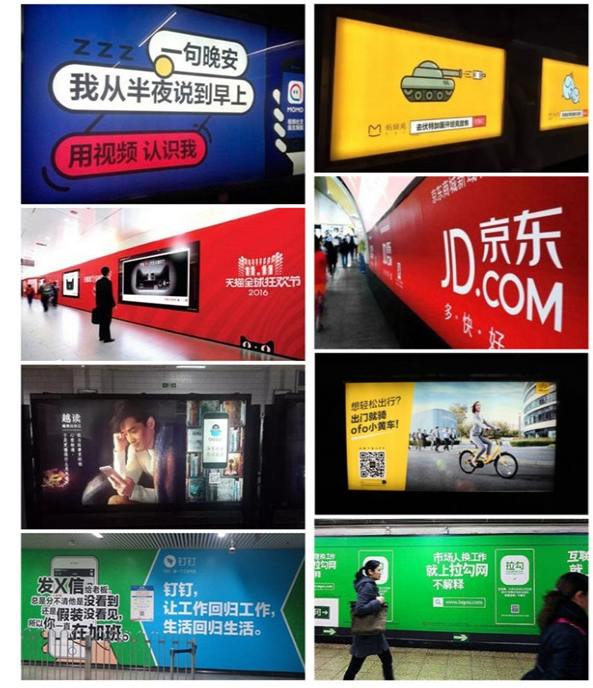 簡(jiǎn)單配色、重復(fù)表達(dá)。網(wǎng)易云音樂、知乎、陌陌、美團(tuán)、京東都用,產(chǎn)品代表色來(lái)進(jìn)行地鐵刷屏,長(zhǎng)時(shí)間內(nèi)大量重復(fù),可以讓人將品牌與顏色畫上等號(hào),進(jìn)而達(dá)到占領(lǐng)消費(fèi)者心智的目的。